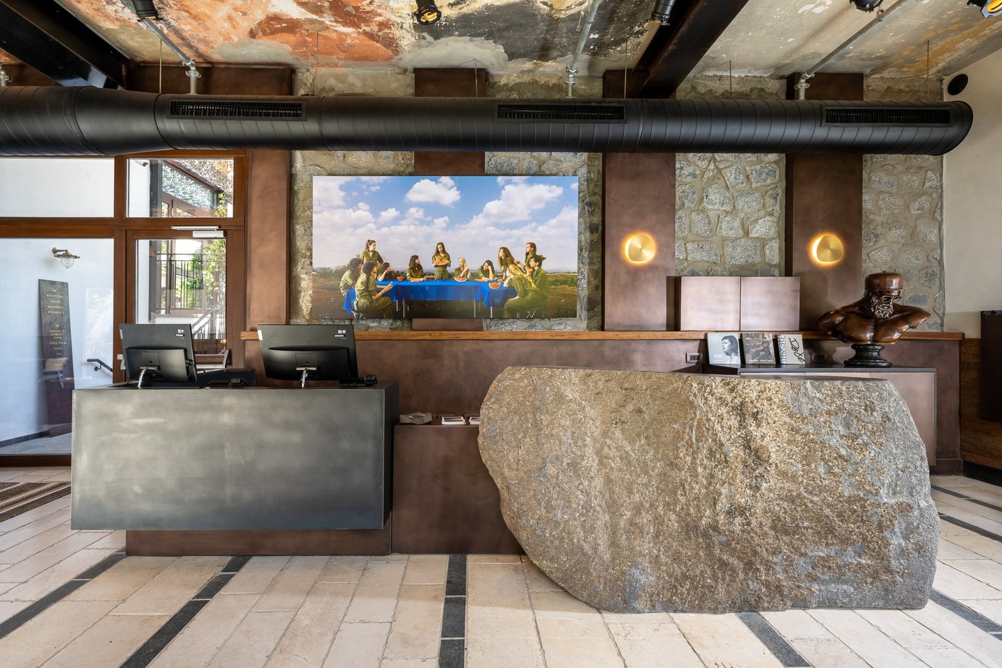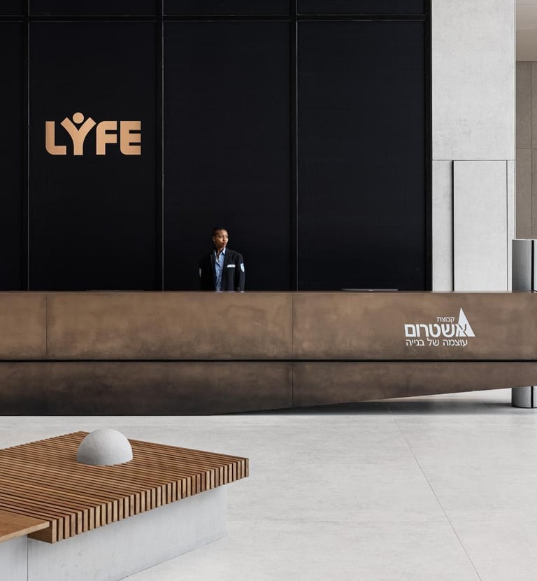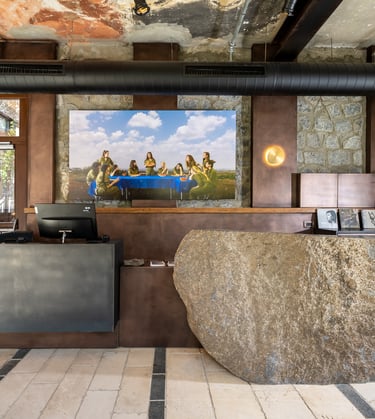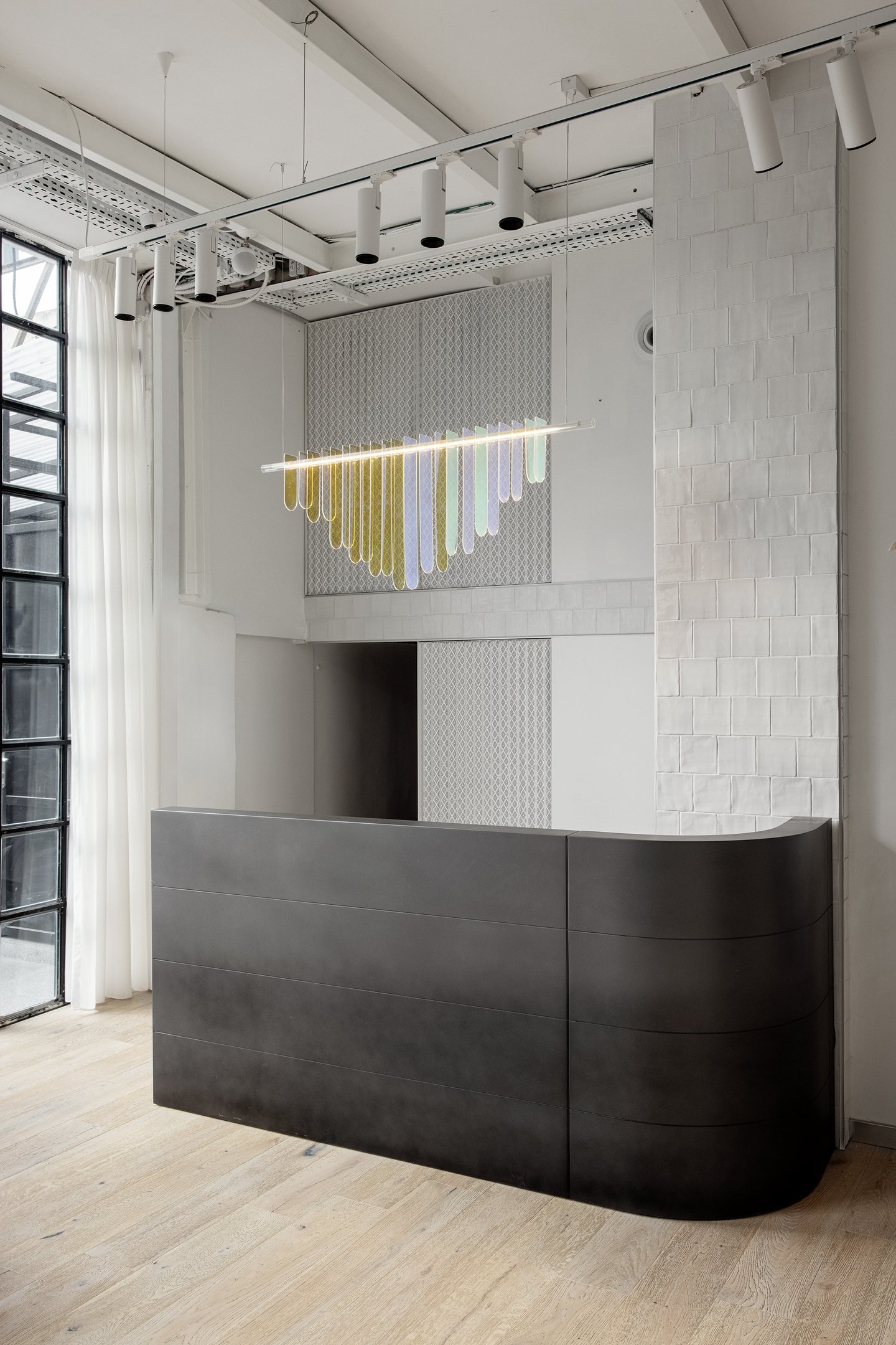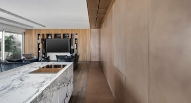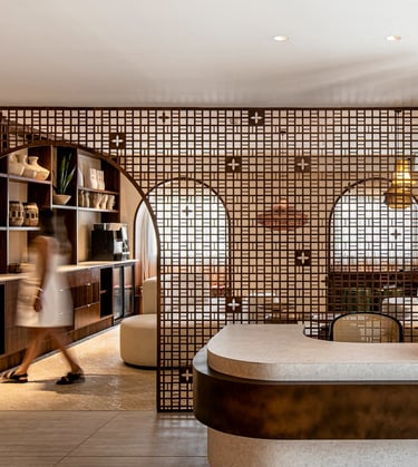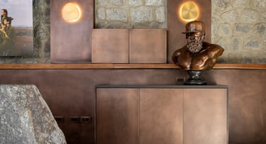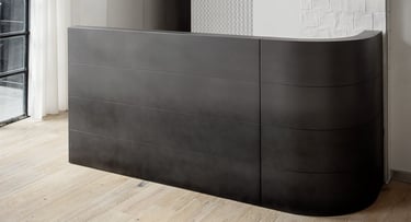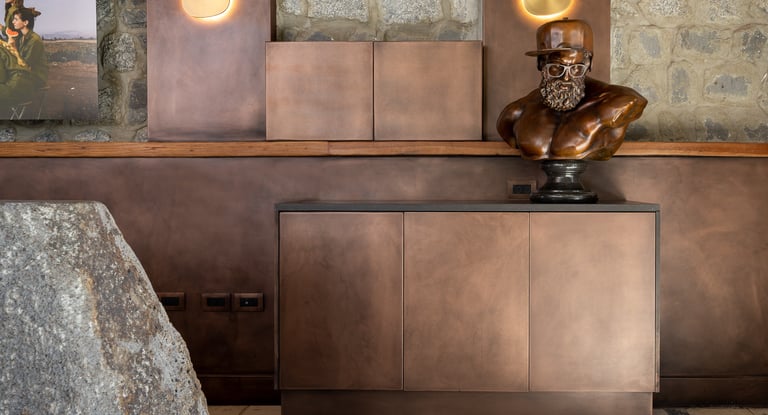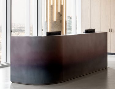 Copper,patinated applied on reception desks and elements \ liquid metal